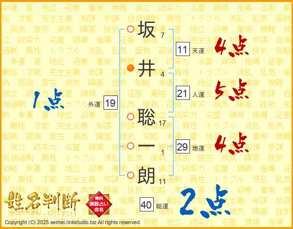 坂(7画)井(4画) 聡(17画)一(1画)朗(11画)