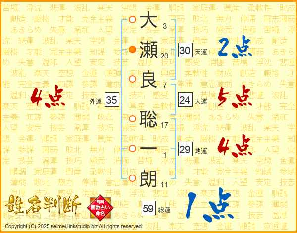 大(3画)瀬(20画)良(7画) 聡(17画)一(1画)朗(11画)