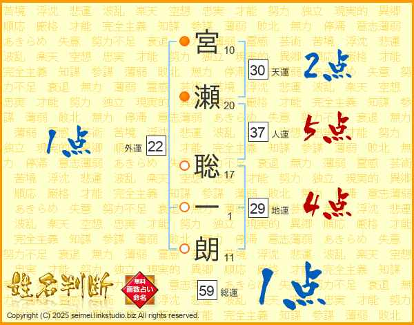 宮(10画)瀬(20画) 聡(17画)一(1画)朗(11画)