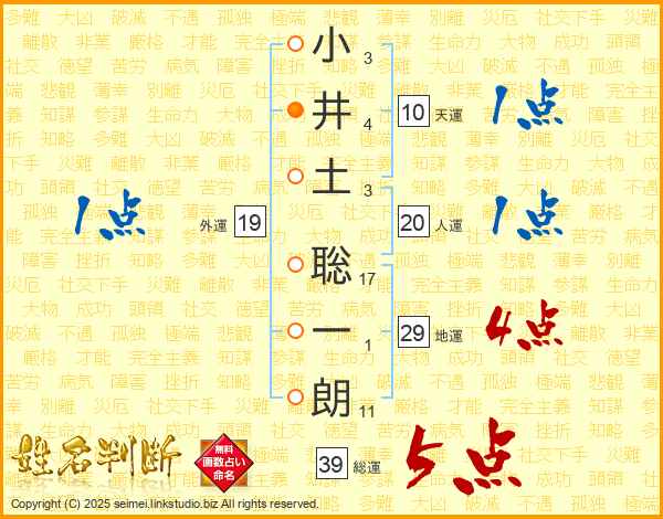 小(3画)井(4画)土(3画) 聡(17画)一(1画)朗(11画)