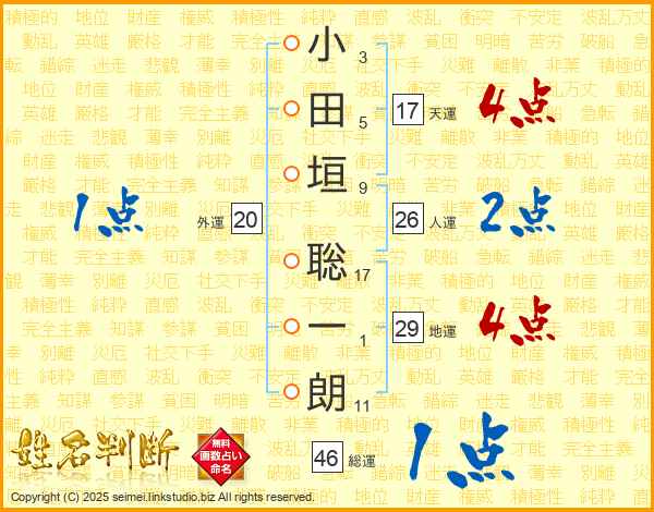 小(3画)田(5画)垣(9画) 聡(17画)一(1画)朗(11画)
