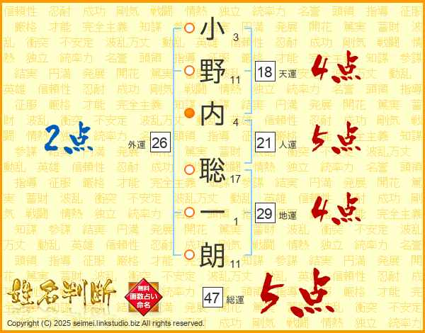 小(3画)野(11画)内(4画) 聡(17画)一(1画)朗(11画)
