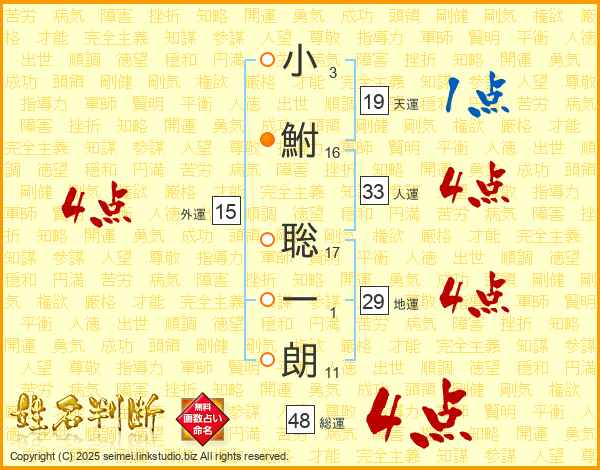 小(3画)鮒(16画) 聡(17画)一(1画)朗(11画)