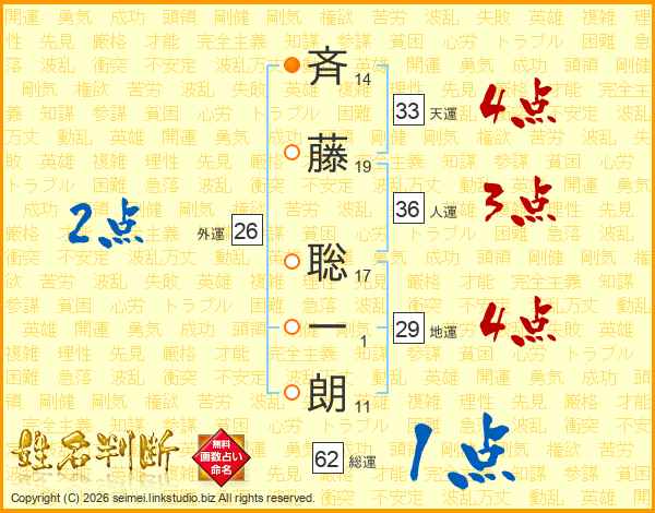 斉(14画)藤(19画) 聡(17画)一(1画)朗(11画)
