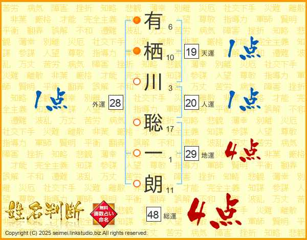 有(6画)栖(10画)川(3画) 聡(17画)一(1画)朗(11画)