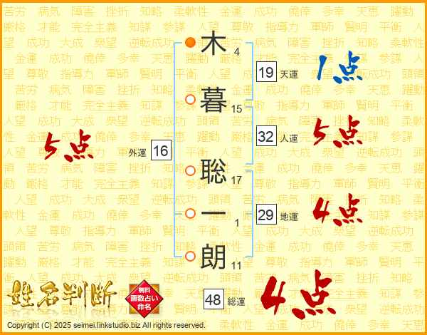 木(4画)暮(15画) 聡(17画)一(1画)朗(11画)