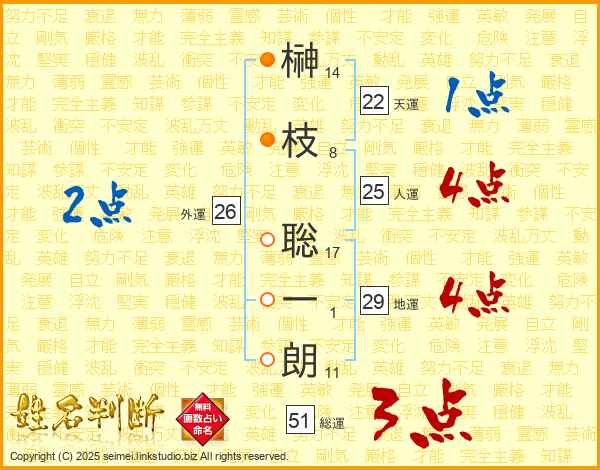 榊(14画)枝(8画) 聡(17画)一(1画)朗(11画)