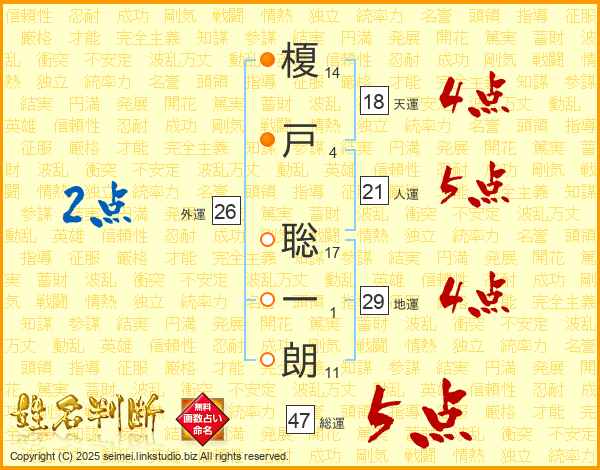 榎(14画)戸(4画) 聡(17画)一(1画)朗(11画)