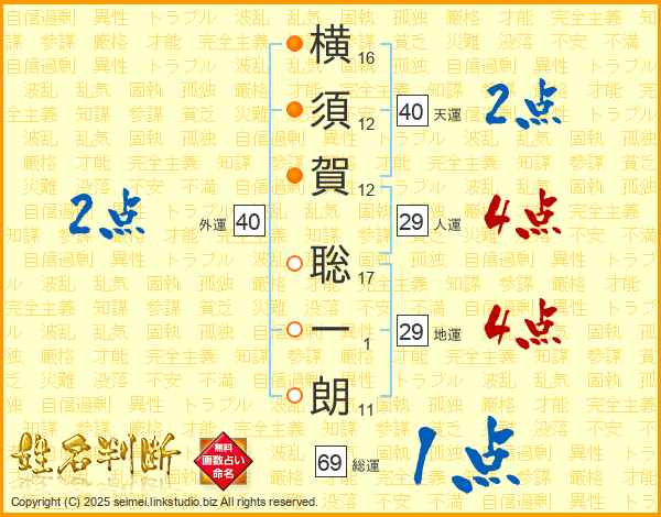 横(16画)須(12画)賀(12画) 聡(17画)一(1画)朗(11画)