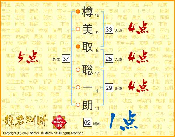 樽(16画)美(9画)取(8画) 聡(17画)一(1画)朗(11画)