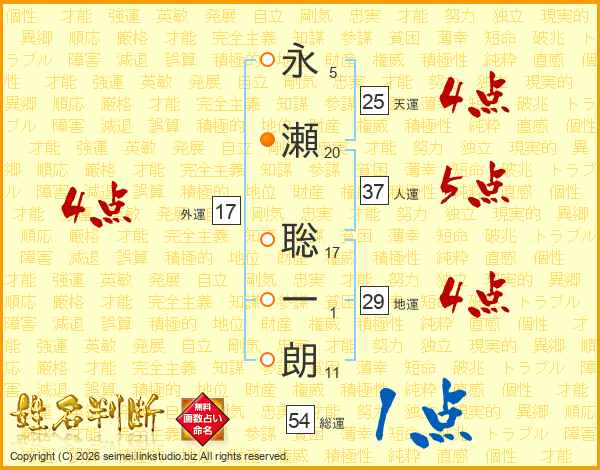 永(5画)瀬(20画) 聡(17画)一(1画)朗(11画)