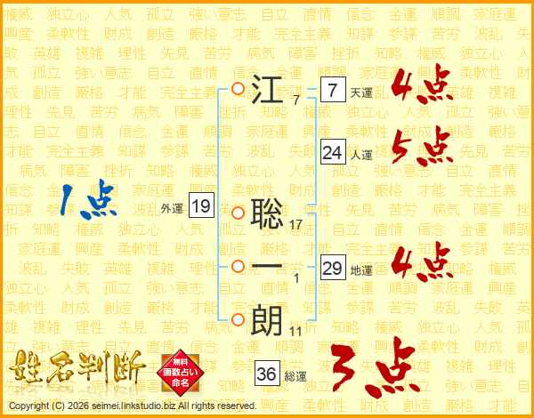 生活面を象徴する運勢です。外部から受ける影響力を表し、結婚運、家庭運や職場、環境への順応性を表します。総運から人運を引いた画数。姓や名が1文字の場合を除く。