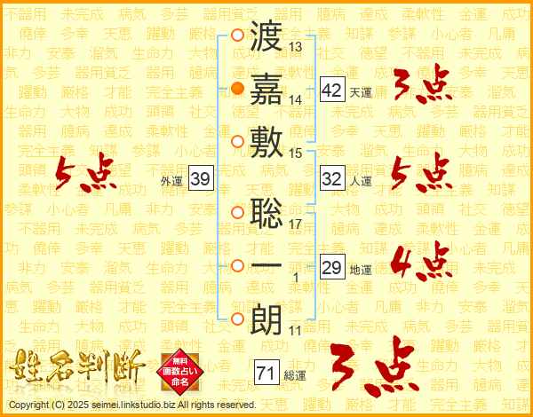 渡(13画)嘉(14画)敷(15画) 聡(17画)一(1画)朗(11画)