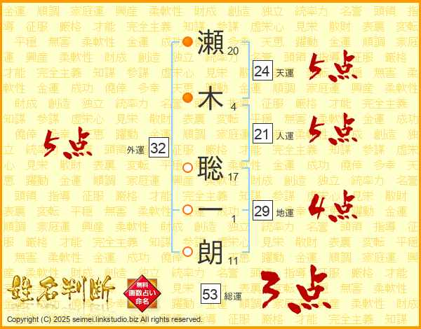 瀬(20画)木(4画) 聡(17画)一(1画)朗(11画)
