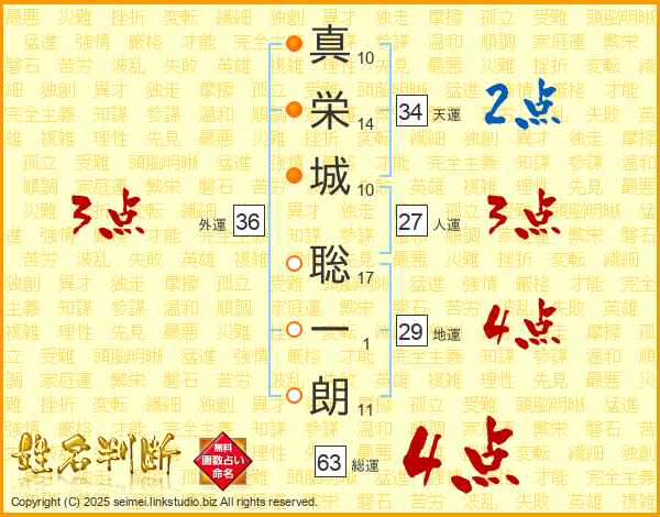 真(10画)栄(14画)城(10画) 聡(17画)一(1画)朗(11画)