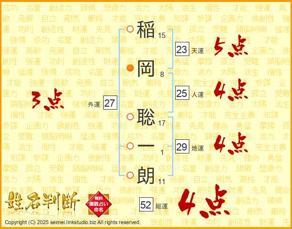 稲(15画)岡(8画) 聡(17画)一(1画)朗(11画)