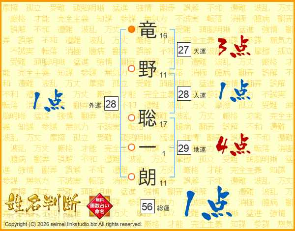 竜(16画)野(11画) 聡(17画)一(1画)朗(11画)