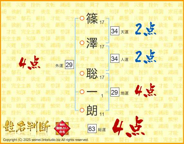 篠(17画)澤(17画) 聡(17画)一(1画)朗(11画)