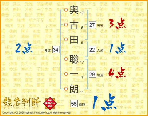 與(17画)古(5画)田(5画) 聡(17画)一(1画)朗(11画)