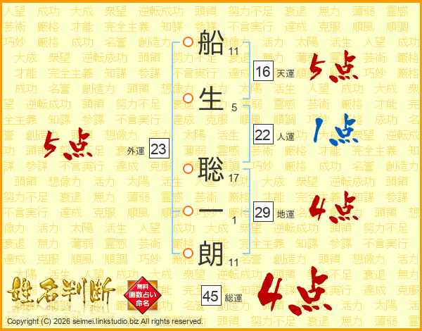 船(11画)生(5画) 聡(17画)一(1画)朗(11画)