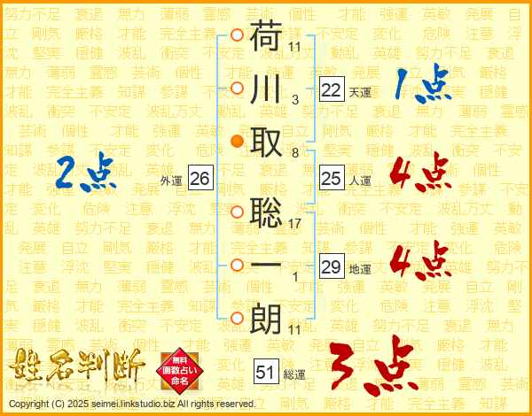 荷(11画)川(3画)取(8画) 聡(17画)一(1画)朗(11画)