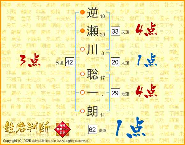 逆(10画)瀬(20画)川(3画) 聡(17画)一(1画)朗(11画)