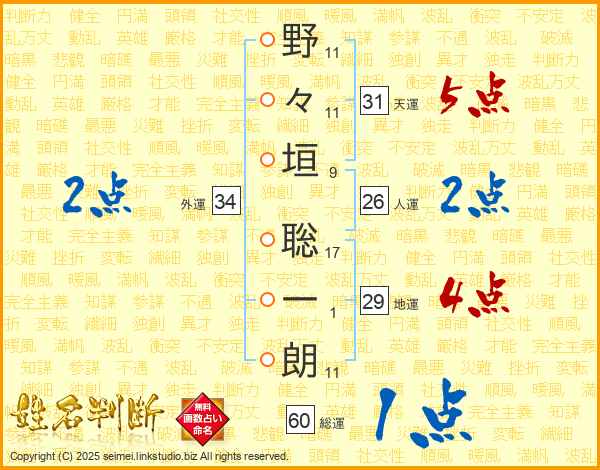 野(11画)々(11画)垣(9画) 聡(17画)一(1画)朗(11画)