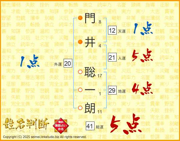 門(8画)井(4画) 聡(17画)一(1画)朗(11画)