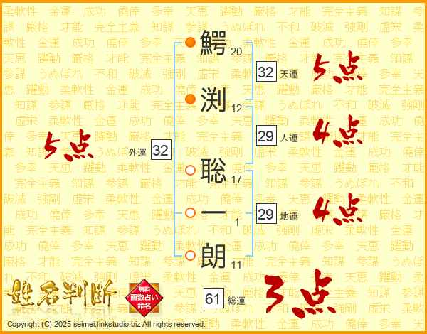 鰐(20画)渕(12画) 聡(17画)一(1画)朗(11画)