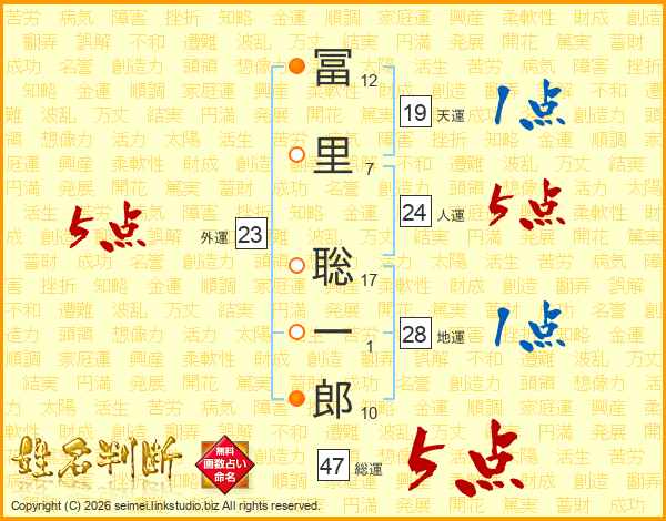 冨(12画)里(7画) 聡(17画)一(1画)郎(10画)