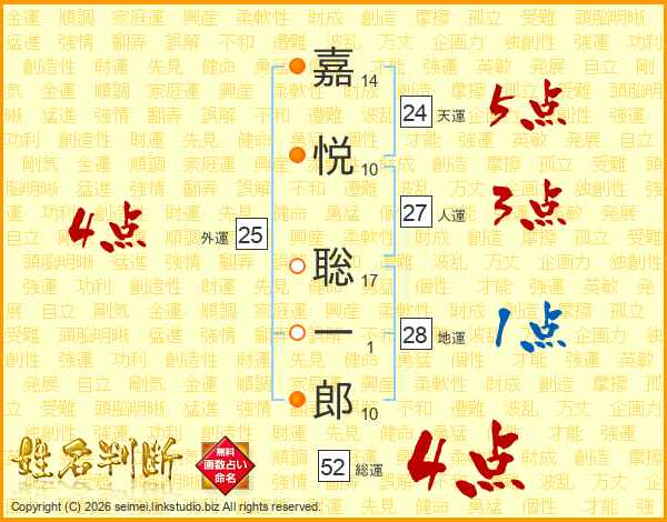 嘉(14画)悦(10画) 聡(17画)一(1画)郎(10画)