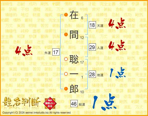 在(6画)間(12画) 聡(17画)一(1画)郎(10画)