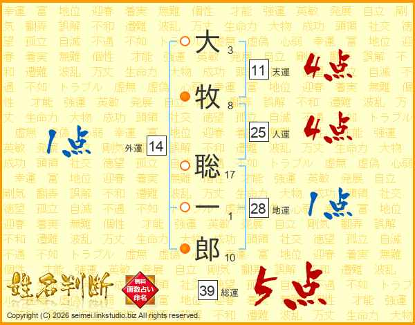 大牧聡一郎さんの総運は39画の5点!