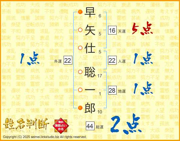 早(6画)矢(5画)仕(5画) 聡(17画)一(1画)郎(10画)