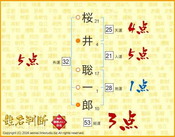 桜(21画)井(4画) 聡(17画)一(1画)郎(10画)