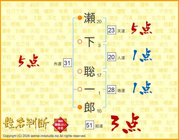 瀬(20画)下(3画) 聡(17画)一(1画)郎(10画)