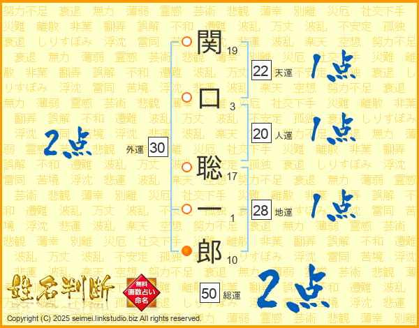 関(19画)口(3画) 聡(17画)一(1画)郎(10画)