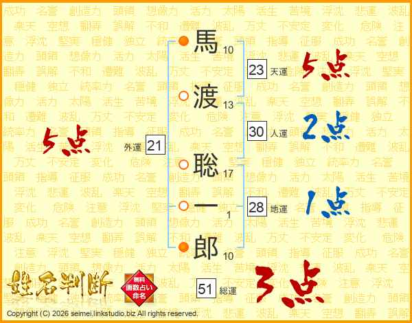 馬(10画)渡(13画) 聡(17画)一(1画)郎(10画)