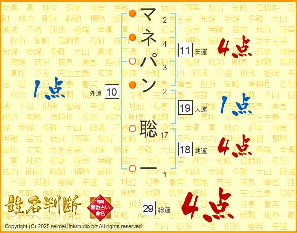 マ(2画)ネ(4画)パ(3画)ン(2画) 聡(17画)一(1画)
