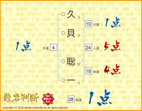 久(3画)貝(7画) 聡(17画)一(1画)