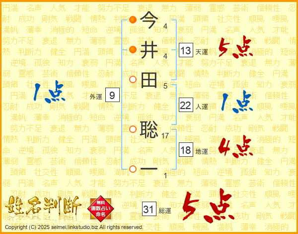 今(4画)井(4画)田(5画) 聡(17画)一(1画)