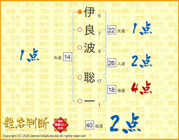 伊(6画)良(7画)波(9画) 聡(17画)一(1画)