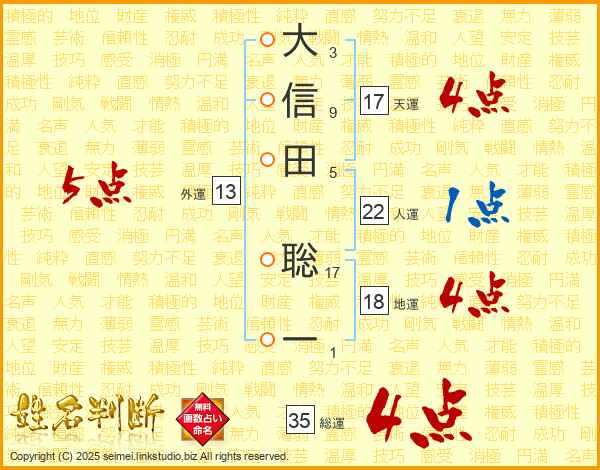大(3画)信(9画)田(5画) 聡(17画)一(1画)