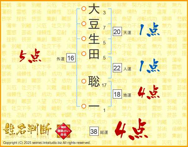 大(3画)豆(7画)生(5画)田(5画) 聡(17画)一(1画)