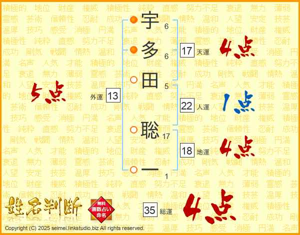 宇(6画)多(6画)田(5画) 聡(17画)一(1画)