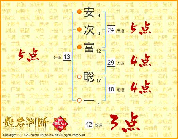 安(6画)次(6画)富(12画) 聡(17画)一(1画)
