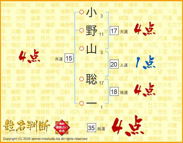 小(3画)野(11画)山(3画) 聡(17画)一(1画)