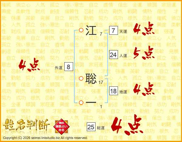 生活面を象徴する運勢です。外部から受ける影響力を表し、結婚運、家庭運や職場、環境への順応性を表します。総運から人運を引いた画数。姓や名が1文字の場合を除く。