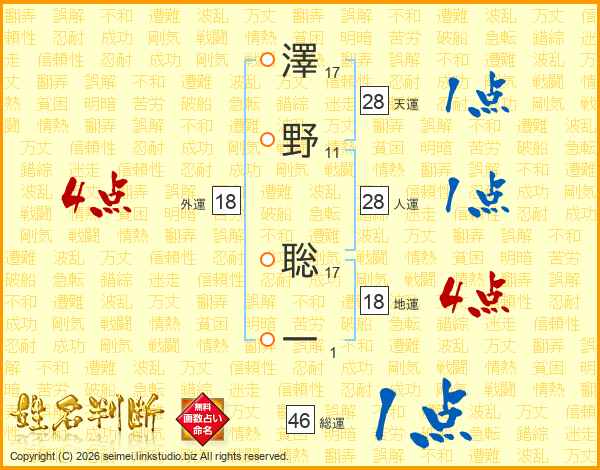 生活面を象徴する運勢です。外部から受ける影響力を表し、結婚運、家庭運や職場、環境への順応性を表します。総運から人運を引いた画数。姓や名が1文字の場合を除く。