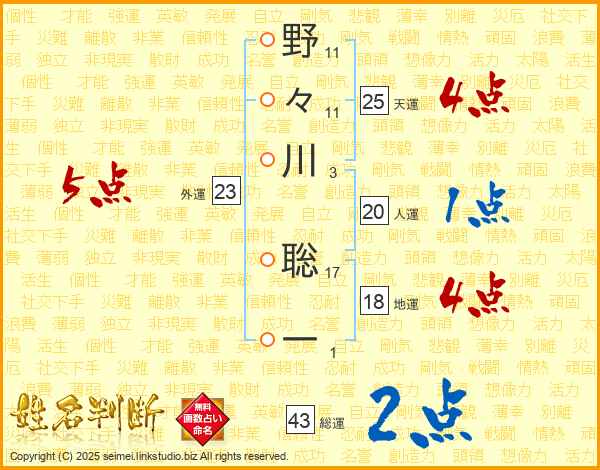 生活面を象徴する運勢です。外部から受ける影響力を表し、結婚運、家庭運や職場、環境への順応性を表します。総運から人運を引いた画数。姓や名が1文字の場合を除く。